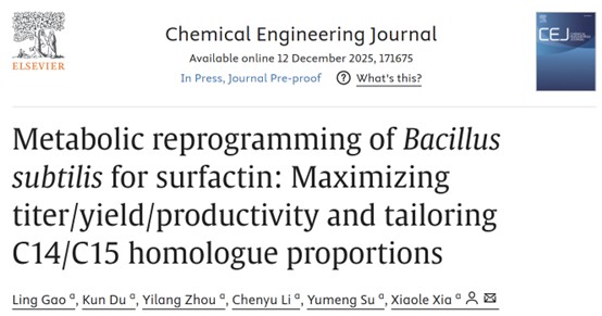 近期,beat365在线唯一官网夏小乐教授团队在细胞工厂高效合成脂肽方面取得重要进展,研究成果“Metabolic reprogramming of Bacillus subtilis for surfactin: Maximizing titer/yield/productivity and tailoring C14/C15 homologue proportion”发表于Chemical Engineering Journal (IF=13.2)(https://doi.org/10.1016/j.cej.2025.171675)。