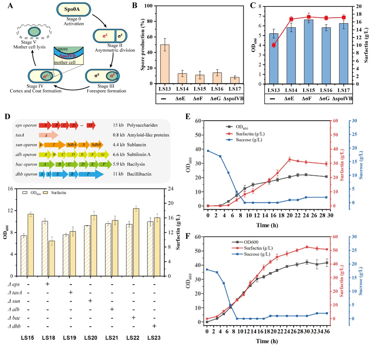 为解决上述问题,本研究通过系统性地重编程枯草芽孢杆菌脂肽生物合成和中心碳代谢,构建了具有高TYP指数的细胞工厂。首先,通过重新设计原生启动子缓解了转录限制使SrfA合成酶在不引发细胞毒性的情况下实现高且持续的表达;其次,采用“推拉促阻”方法解决了细胞生长与生产之间的权衡,减少碳溢出和碳流失获得最强生产菌株LS22,在7.5-L补料发酵产Surfactin滴度达到52.6 g/L,蔗糖产率为0.34 g/g(理论途径产率的75%),生产效率达1.75 g/L/h,是迄今为止报告的最高TYP指数。最后,通过调控细胞内脂肪酸池(喂食异戊酸、苏氨酸或异丁酸)使C14-Surfactin或C15-Surfactin同系物比例富集至超过73%,实现了C14/C15同源物比例的定制化生产。这项工作为其他脂肽类抗生素的微生物细胞工厂工程化提供了可推广的蓝图,最大化细胞生长与表面素生成之间的协同效应对于提升细胞工厂效率至关重要。