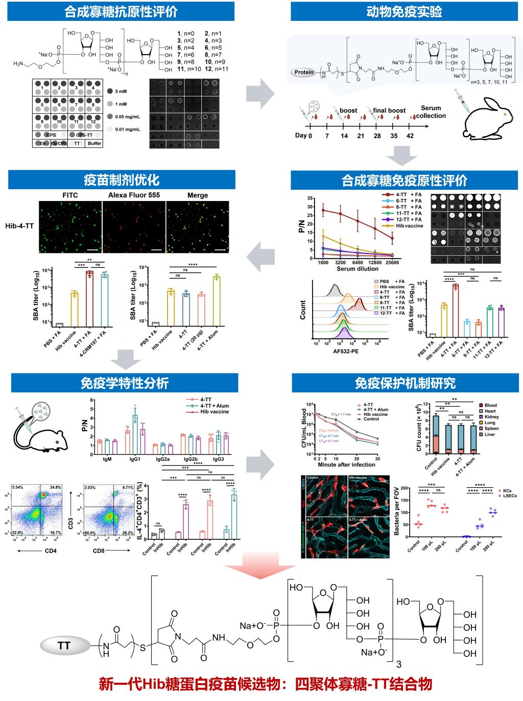 在此基础上,研究团队以“疫苗制剂优化——免疫学特征解析——保护机制阐明”为主线,搭建了贯穿体内外的系统性评价平台(图2)。在疫苗制剂优化方面,四聚体与载体蛋白TT的缀合物在诱导IgG抗体滴度、菌体亲和力及血清杀菌活性方面均显著优于与CRM197的缀合物;在无佐剂条件下,四聚体缀合物4-TT在相同接种剂量下可获得与上市Hib多糖蛋白疫苗相当的免疫保护效力,而引入铝佐剂则显著加速了免疫启动,为快速建立免疫屏障提供了强效方案。进一步的疫苗免疫原性评价结果显示,无佐剂的4-TT不仅诱导了与上市疫苗同等水平的IgM及IgG全亚类应答,实现了高效的抗体类别转换,还显著上调了小鼠脾脏CD4+与CD8+ T细胞比例。此外,经灭活Hib菌体特异性刺激后,CD4+ T细胞中IL-4与IFN-γ的高表达进一步证实其能有效驱动Th1/Th2混合型细胞免疫应答。对疫苗保护机制研究也开展了研究,利用小鼠菌血症模型验证了4-TT抗血清突出的体内细菌清除能力,不仅能在30分钟内高效清除血液循环中的Hib致病菌,更通过抗体介导机制显著增强了肝脏驻留巨噬细胞(KCs)与肝窦内皮细胞(LSECs)对病原体的靶向捕获效率。上述系统性的研究确证了4-TT候选疫苗具备媲美现有商业疫苗的免疫保护效力,为其后续临床研究提供了详实、扎实的基础。
