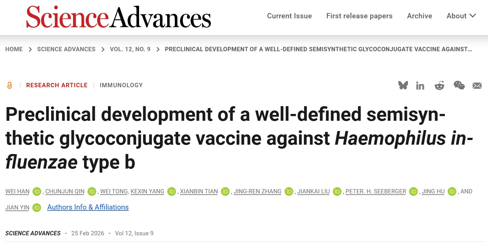 近期,beat365在线唯一官网、糖化学与生物技术教育部重点实验室尹健教授团队在细菌糖蛋白疫苗研究方面取得新进展,研究成果“Preclinical development of a well-defined semisynthetic glycoconjugate vaccine against Haemophilus influenzae type b”发表于Science Advances。