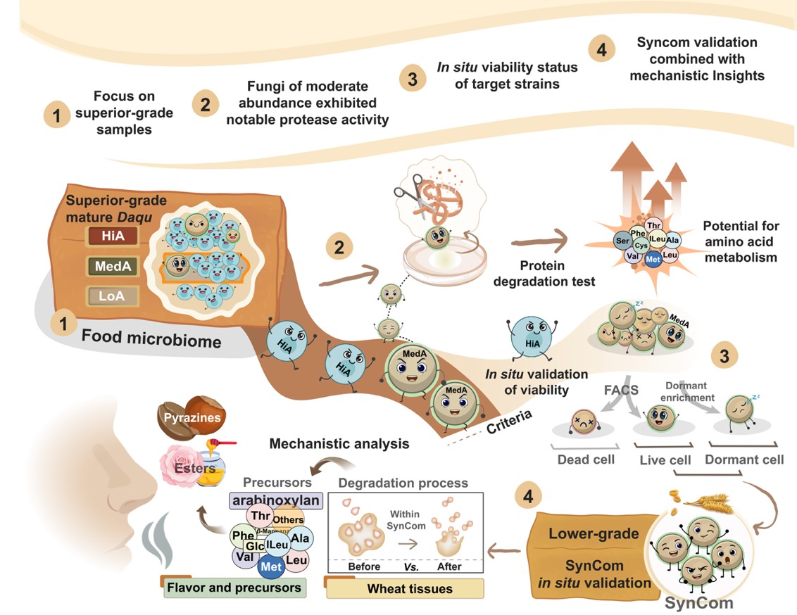 高温大曲是我国历史经典产业,劳动强度极大、劳动环境恶劣,迫切需要现代化产业转型升级。然而,酿造机制不清、功能菌种不明,是限制高温大曲高品质现代化升级及国际化表达的主要瓶颈。由于大曲具有强空间异质性和极其复杂的菌群结构,传统的宏基因组等技术往往只能反映“群体平均值”,难以精准鉴定在大曲极端环境下真正发挥功能的活性个体。