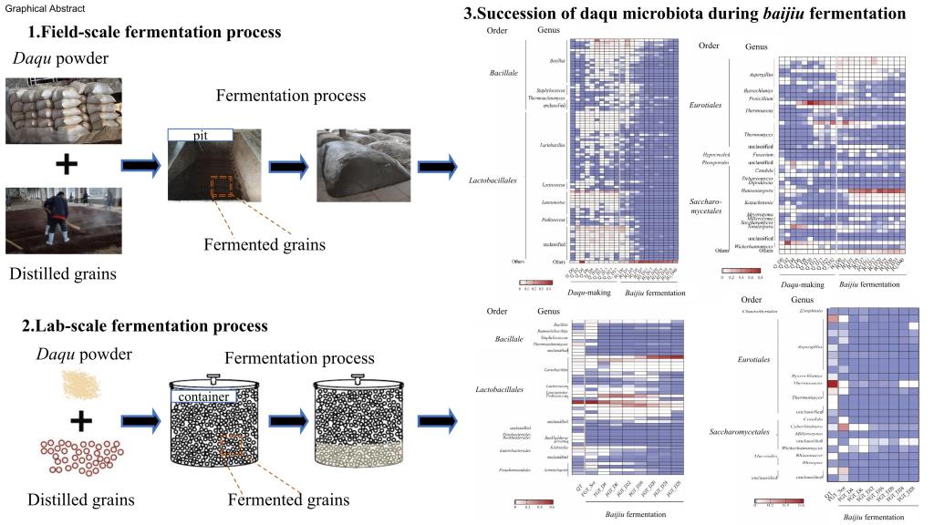 许正宏教授团队以中温大曲为案例,联合应用宏组学、风味化学等研究方法,探究了大曲发酵过程中微生物群落演替与理化特性变化规律,揭示了大曲风味形成过程中的微生物动态代谢网络,并解析了大曲产香、产酶的微生物基础和形成机制,并进一步通过高通量测序方法在物种水平上追踪了中温大曲各类微生物在白酒发酵过程中“兴盛衰落”的演替规律,解析了大曲酿造功能的微生物基础,为科学认识大曲的酿造功能提供了数据支撑。