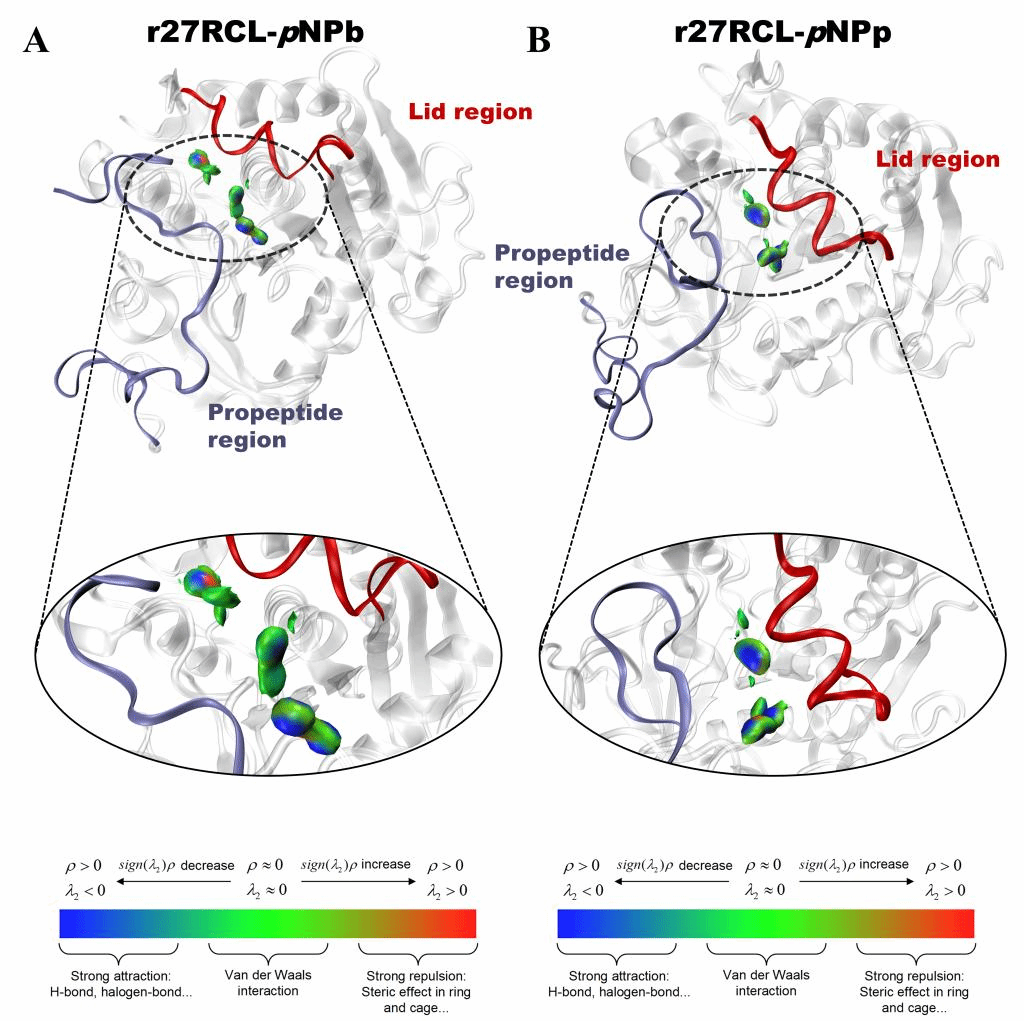 图1.独立梯度模型分析华根霉脂肪酶前肽与盖子在pNPb(A)与pNPp(B)底物体系中的相互作用