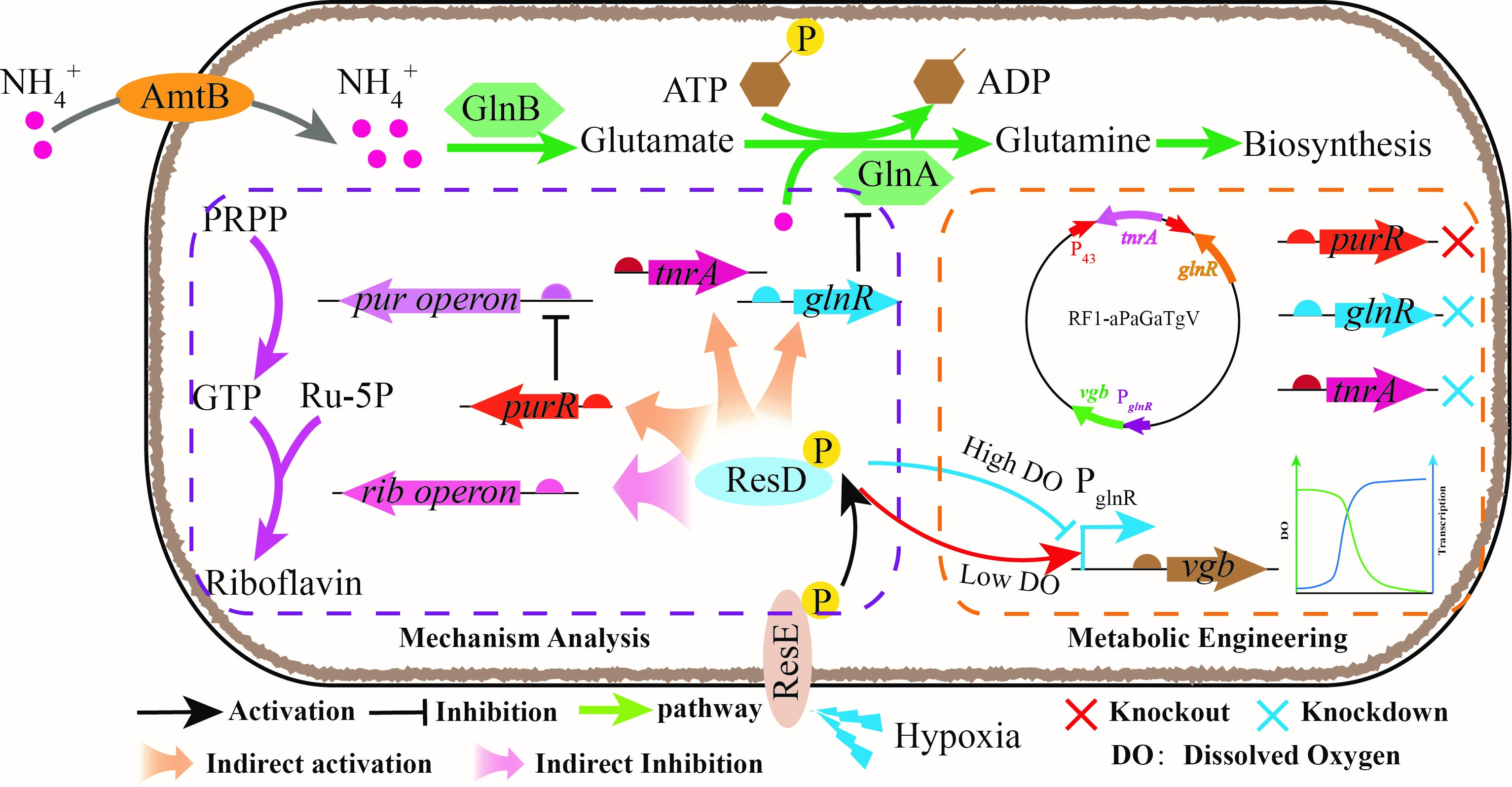 饶志明团队首先通过比较转录组分析不同溶氧条件下枯草芽孢杆菌全基因组范围内基因表达变化。氧气供应不足导致枯草芽孢杆菌数千个基因的表达发生了显著变化,其中包括嘌呤代谢、氮代谢、能量代谢等代谢途径相关的基因。核黄素的前体物质GTP是通过嘌呤代谢途径合成的,编码该途径关键酶由pur操纵子的基因编码。低溶氧下pur操纵子基因发生显著变化,其中,基因purD和purF表达下调最为明显,分别为69.55和23.92倍,这与RT-qPCR分析结果一致。而嘌呤途径抑制因子purR表达水平上调2.64倍,这可能是导致嘌呤途径基因下调的主要因素。因此,敲除基因purR解除对嘌呤途径的限制,使核黄素产量提高16.21%。溶氧供应不足导致氮代谢的两个全局调节因子TnrA和GlnR表达水平显著上调,该两个调控因子参与细胞内氮代谢。在缺氧条件下,许多细菌具有表达呼吸和同化硝酸盐还原酶的能力,利用环境中丰富的氮源作为呼吸底物和营养物质促进生长。因此,利用反义RNA策略抑制基因tnrA和glnR的表达使核黄素的产量分别提高12.05%和23.37%。为了进一步缓解溶氧限制,在枯草芽孢杆菌中过表达vgb基因(编码血红蛋白VHb)缓解溶氧限制,且利用基因tnrA的启动子动态控制vgb基因的表达,该启动子在低溶氧下表达水平显著提高。因此,在摇瓶发酵中动态控制基因vgb表达使核黄素产量提高18.62%。最后,利用组合代谢工程策略解除嘌呤代谢限制,平衡细胞内氮代谢并过表达基因vgb,使核黄素产量在摇瓶发酵水平提高50.78%,达到2.5g/l。工程菌株的核黄素产量在5L发酵罐水平提高45.51%,滴度达到10.71 g/l。本研究为缓解溶氧限制,进一步提高核黄素产量提高提供新的思路和方向。