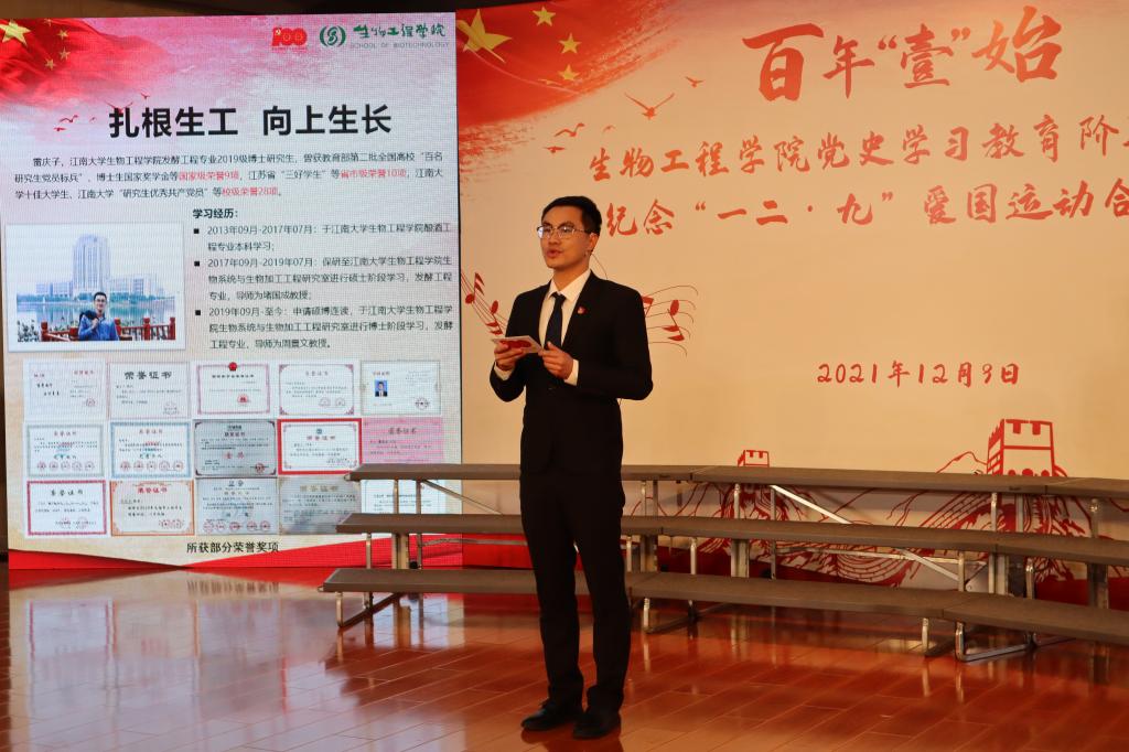 主讲人从“学、信、行”三个篇章回顾了学院一年来通过“固圈”“扩圈”“破圈”,深入历史现场,坚持学思践悟,将党史学习教育的成果落实在“我为师生办实事”上,入脑入心、走深走实,汲取党史智慧、砥砺初心使命。随后,在场观众共同观看“筑精神谱系,扬精神血脉”百名学生党员走访百名老党员视频展。全国高校“百名研究生党员标兵”雷庆子、酿造微生物学与应用酶学研究室学生党支部成员杨诗琪、“百年大党正年轻”宣讲团团长张海云分享学习与实践感悟,呼吁青年学生要坚定理想信念、夯实学科自信,肩负时代使命,为实现伟大复兴的中国梦而不懈奋斗。