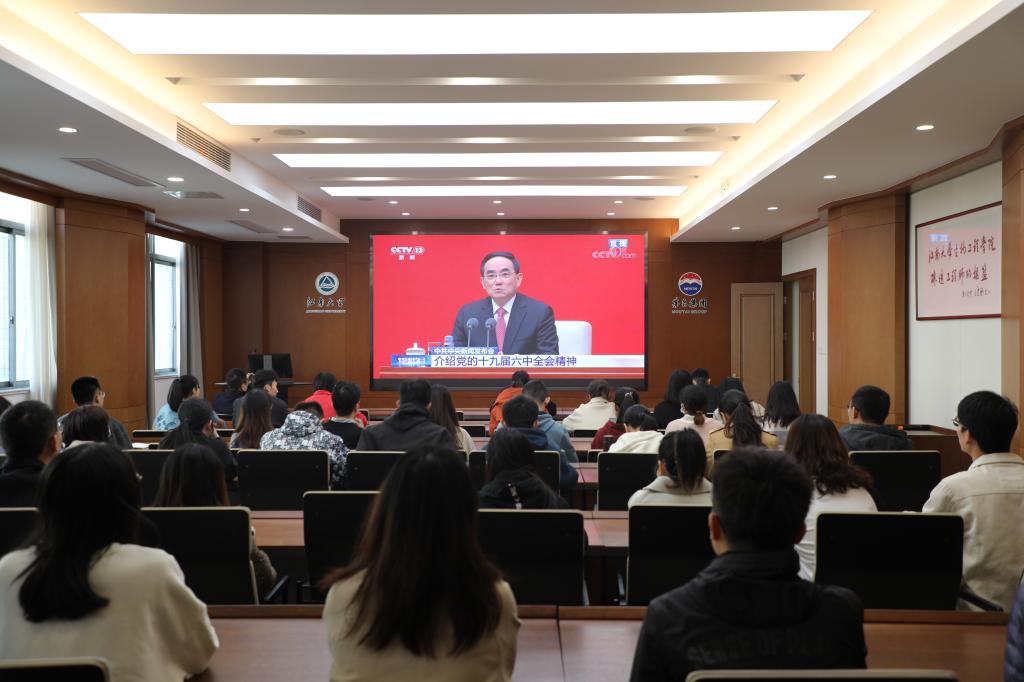 11月12日上午,beat365在线唯一官网组织师生党员代表在茅台厅收看了关于党的十九届六中全会新闻发布会直播,学院党委书记王维、院长许正宏,院领导周云龙、聂尧、陈献忠等参加了学习。
