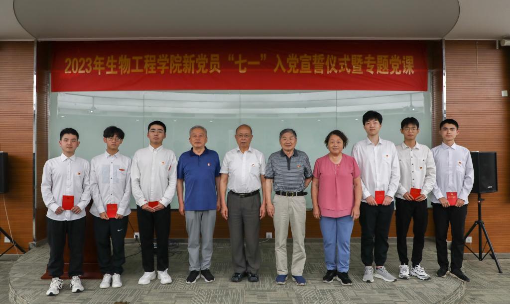 入党宣誓强党性。6月30日下午,学院党委举行2023年新党员入党宣誓仪式。全体与会人员通过视频形式回顾了“百名学生走访百名老党员”的活动历程。学院党委副书记、副院长林丹宣读新发展预备党员名单。学院关工委陶文沂、诸葛健、吴骥一、帅桂兰为新党员代表佩戴党员徽章。由诸葛健领誓,预备党员举起右拳,慷慨激昂,在党旗下光荣宣誓。生物2001班刘天宇代表全体新党员发言,向党组织承诺立志做有理想、敢担当、能吃苦、肯奋斗的新时代好青年。此次仪式进一步增强了青年党员的责任感与使命感,激励其投身全面建设社会主义现代化国家火热实践。