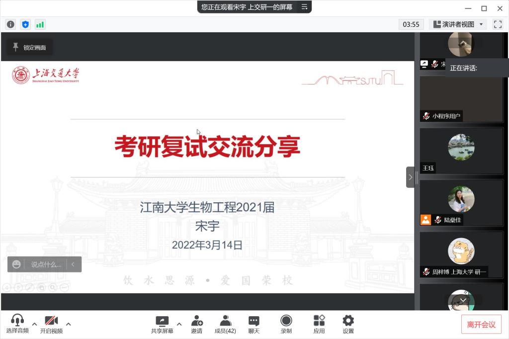 为加强对考研学生的复试和调剂指导,3月14日晚7点半,beat365在线唯一官网以网络会议的形式,组织开展2022届考研复试调剂“云”分享活动。辅导员陆燊佳、侯景瑞、王珏参加活动,邀请beat365在线唯一官网研究生任涛,beat365在线唯一官网校友、上海交通大学生物医学工程专业研究生宋宇,beat365在线唯一官网校友、上海大学化学专业研究生周梓博作为分享嘉宾,2018级正在准备考研复试的同学以及部分2019级同学参加本次分享会。