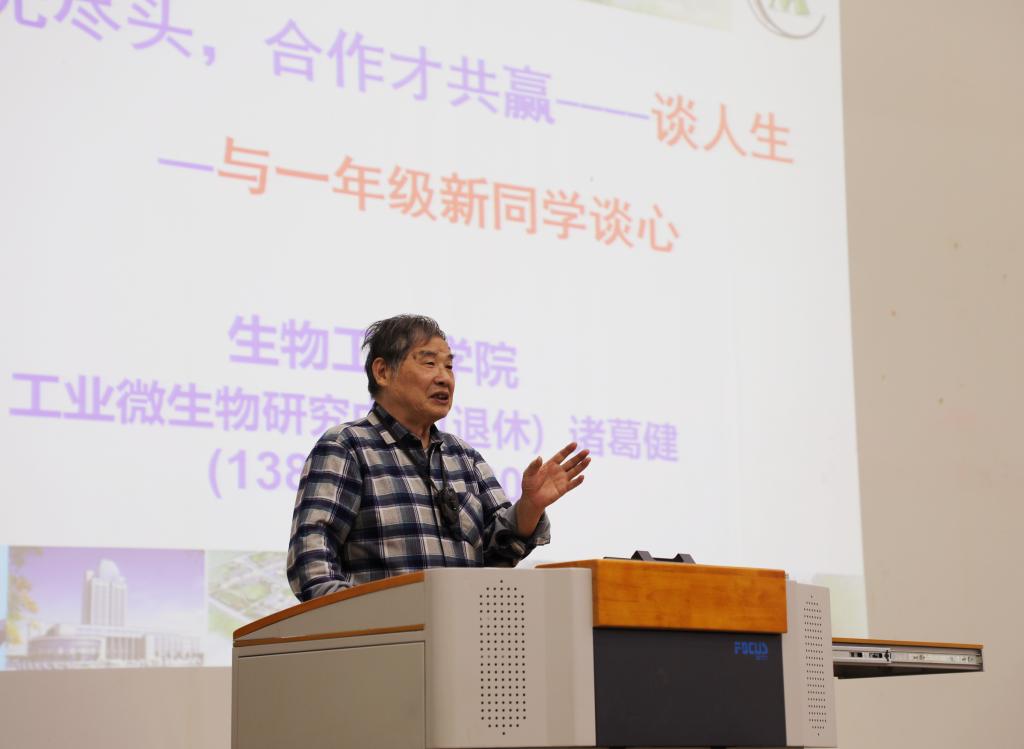 整场讲座,诸葛健老师语言风趣幽默,讲述生动,为同学们展示了一幅幅动人的奋斗画面,即使已处耄耋之年,仍然掩盖不住他对讲台的热爱、对学生的期待,他鼓励同学们虚心好学,认识自我,用创新、诚实、和睦促成硕果。“国家的希望寄托在你们身上!努力吧!年轻人!”诸葛健老师的殷切寄语赢得了全场热烈的掌声,激励着新同学们向前辈们学习、致敬,努力成为更加出彩的新时代生工人。