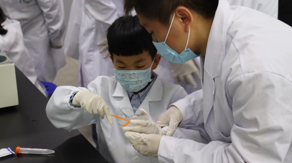 紧接着,来自全国高校“百个研究生样板党支部”生物系统与生物加工工程研究室党支部、“全国党建工作样板支部”酿造微生物学与应用酶学研究室党支部的博士生们带领小朋友亲手体验科学实验。