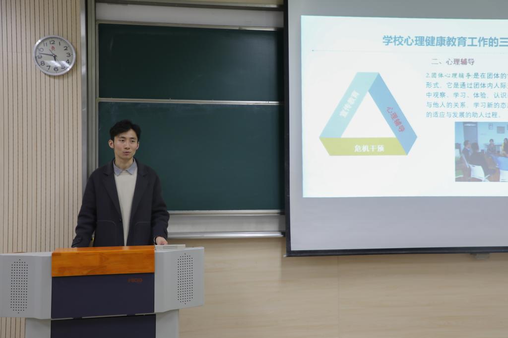 随后,宋大有以《心分享、新起航》为主题,对朋辈心理工作的角色定位和工作职责进行了说明,对工作中的技能与策略进行了全面讲解。他提出,心理委员和宿舍长是我校五级心理工作网络体系的关键环节,是老师与学生沟通的桥梁和纽带,希望同学们能够在心理健康宣传教育、心理健康活动组织、朋辈互助等方面发挥更积极的作用。