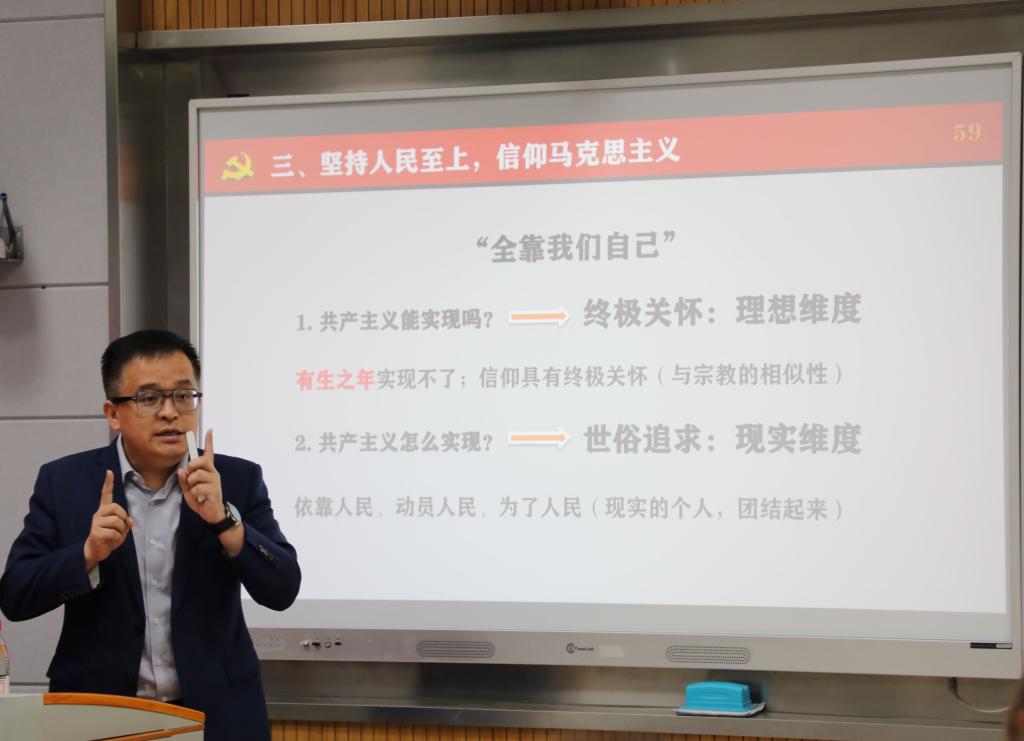 5月23日,“青马工程”培训班理论学习系列讲座第三讲,由beat365在线唯一官网马克思主义学院唐忠宝教授以《学习新思想坚定理论自信》为题开讲。唐忠宝教授围绕学习贯彻习近平新时代中国特色社会主义思想,以党的二十大精神为切入点,聚焦“十个明确”的精神实质和丰富内涵,重点从“反对历史虚无主义”“坚持中国式现代化”“信仰马克思主义”等方面着眼分析,以当今网络热点话题讨论为案例开展解读和交流,旨在深入浅出地以年轻人喜闻乐见的宣讲形式和思维方式,向青马班学员传播新时代新思想,引导广大青年树立正确价值观、厚植爱国情怀,与国家同呼吸、与人民共命运,唐忠宝教授的精彩分享为全体学员带来一场耳目一新的思想盛宴。