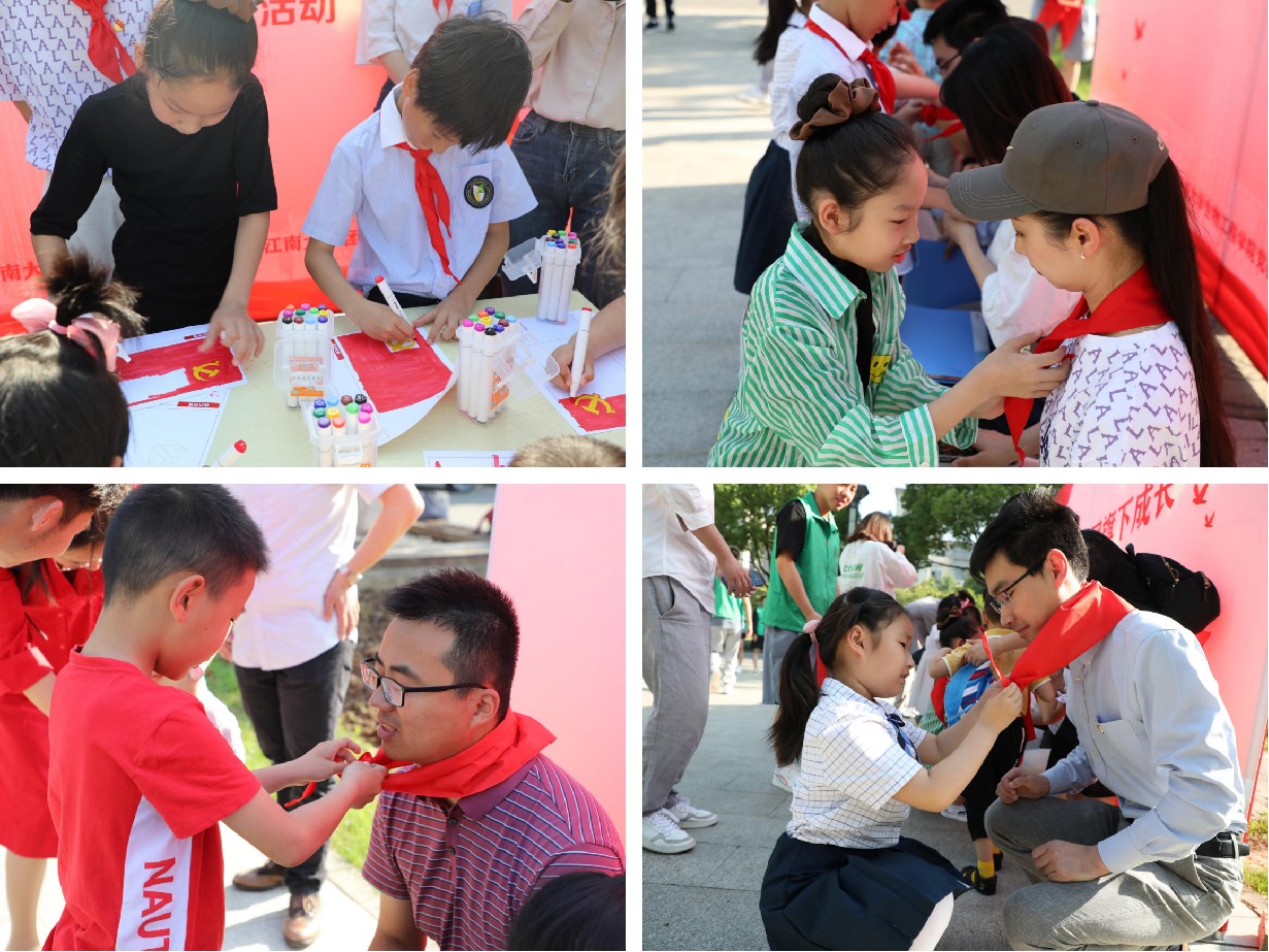 活动开始,在《中国少年先锋队队歌》的歌声中,小朋友们向家长们敬献红领巾,一个个熟悉的动作,体现的是爱与责任的传承。随后,国旗班的大学生们带领小朋友,大手拉着小手,共同组建护旗方阵,昂首阔步,护卫国旗走至旗杆下。伴随着雄壮的《义勇军进行曲》,小学生升旗手与国旗班大学生升旗手共同将五星红旗升至旗杆顶端,成功完成护旗、升旗任务,爱国主义情感充盈活动现场,仪式感满满!