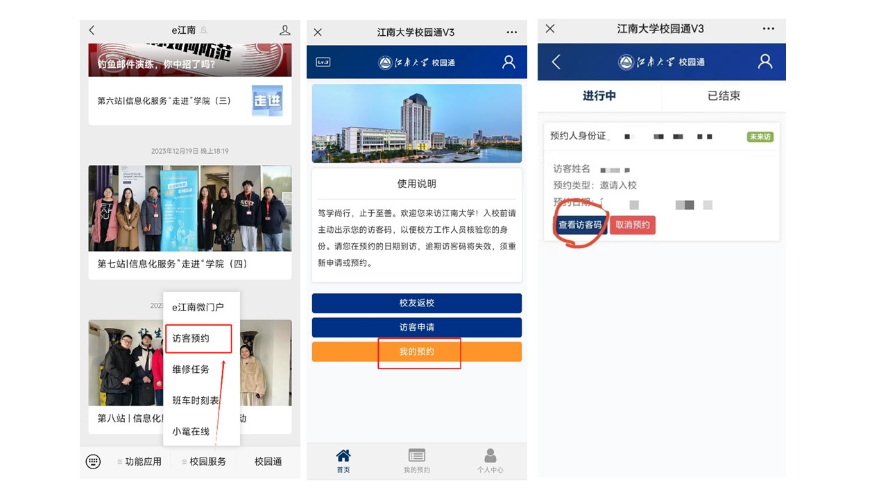 手机关注“e江南”微信公众号,点击屏幕下方“校园服务”中的“访客预约”,进入后点击“我的预约”,点击“查看访客码”即可获得访客码。进入校园时出示访客码。