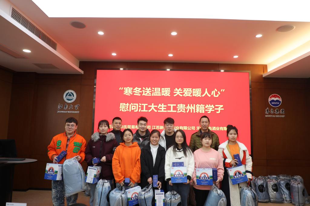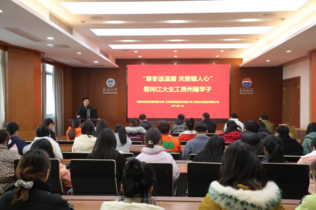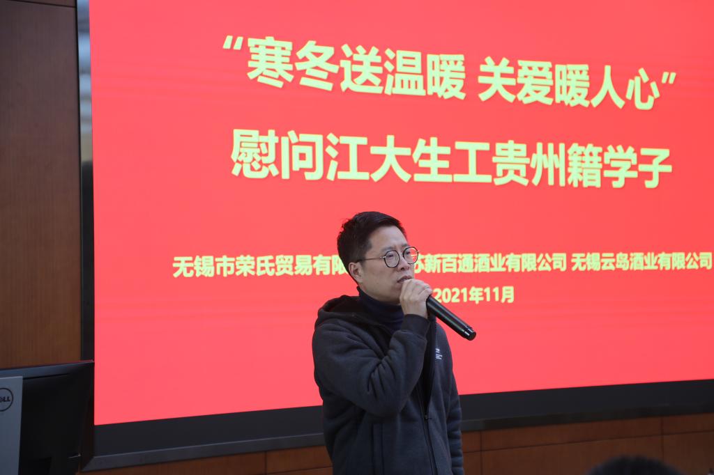 11月23日下午,无锡市荣氏贸易有限公司传承人荣嵘、江苏新百通酒业有限公司总经理赵军、无锡云岛酒业有限公司传承人周科程等企业同仁来到beat365在线唯一官网,慰问学院贵州籍新生以及beat365在线唯一官网-茅台学院酿酒工程联培班学生,并与同学们座谈交流,学院党委副书记兼副院长周云龙、辅导员张同舟、王珏等参加活动。