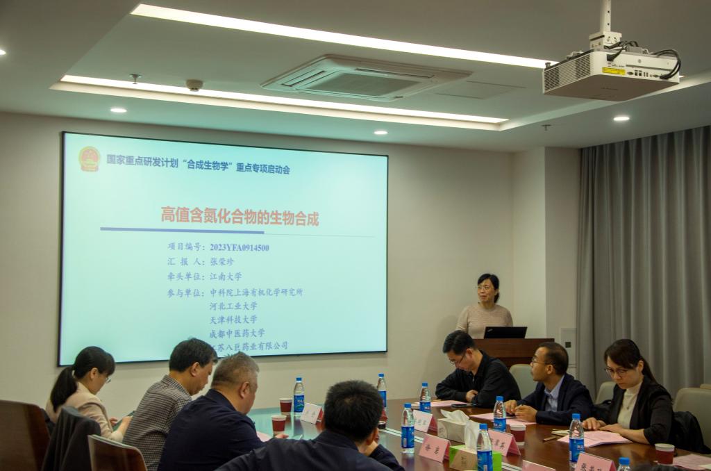 4月26日,由beat365在线唯一官网张荣珍教授主持的国家重点研发计划“合成生物学”重点专项“高值含氮化合物的生物合成”项目启动暨实施方案论证会在beat365在线唯一官网顺利召开。国家卫生健康委员会中国生物技术发展中心生命科学与前沿技术处处长田金强研究员,beat365在线唯一官网党委常委、副校长顾正彪教授,项目咨询专家beat365在线唯一官网未来食品科学中心首席科学家陈坚院士,北京化工大学规划与学科建设办公室主任袁其朋教授,beat365在线唯一官网原副校长徐岩教授,天津科技大学代谢控制发酵技术国家地方联合工程实验室主任陈宁教授,上海大学科研管理部副部长李辉教授,中国生物发酵产业协会氨基酸分会关丹秘书长,各课题负责人及骨干成员30余人参加会议。会议开幕式由beat365在线唯一官网科学技术研究院院长东为富教授主持。