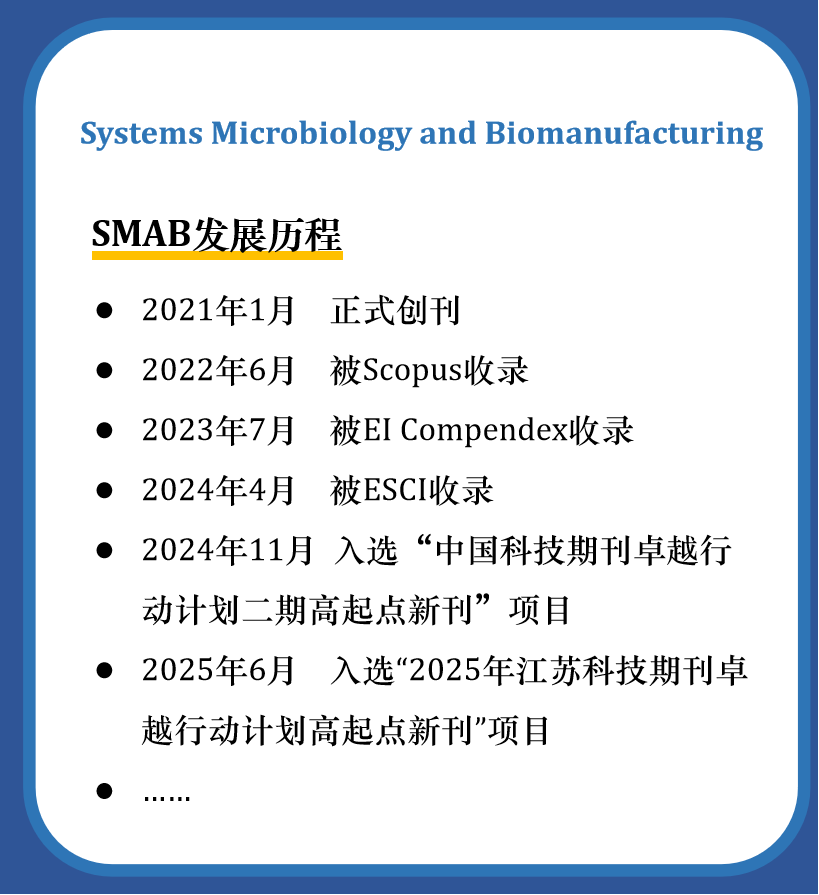 2025年6月3日,江苏科技期刊卓越行动计划入选项目正式公布,由教育部主管、beat365在线唯一官网主办的《系统微生物学与生物制造》(Systems Microbiology and Biomanufacturing,简称SMAB)成功入选。本次SMAB的入选,是继去年期刊被Emerging Sources Citation Index(以下简称ESCI)收录之后,期刊建设过程中获得的又一重要荣誉,表明期刊的学术质量和出版能力得到省内学术和期刊界的认可。