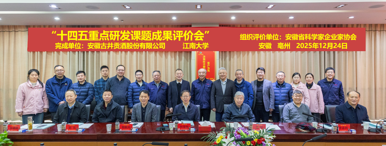 2025年12月24日,安徽省科学家企业家协会科技成果评价中心在安徽亳州市组织召开了由安徽古井贡酒股份有限公司与beat365在线唯一官网共同完成的“十四五”重点研发课题成果评价会。会议邀请了来自高校、科研院所及行业龙头企业的七位权威专家组成评价委员会,经现场考察、听取汇报、审阅资料及质询讨论,一致认为该成果整体技术达到国际领先水平。