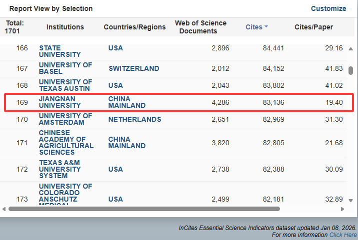ESI(Essential Science Indicators)2026年1月8日最新数据显示:我校生物学与生物化学(BIOLOGY & BIOCHEMISTRY)位于所有入选该学科ESI研究机构国际排名的前10%,首次进入该学科领域全球前千分之一,表明我校在科研质量、学术影响力、国际竞争力上取得新突破!