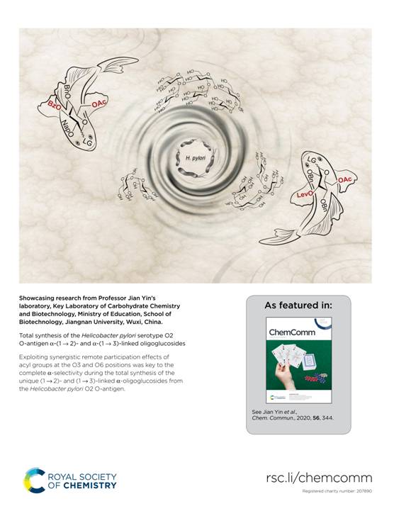 近期,我校beat365在线唯一官网糖化学与生物技术教育部重点实验室尹健教授团队在重要致病菌幽门螺杆菌寡糖抗原全合成研究方面取得新进展。研究成果“Total synthesis of the Helicobacter pylori serotype O2 O-antigen α-(1→2)- and α-(1→3)-linked oligoglucoside”发表于英国皇家化学会旗下《Chemical Communications》(自然指数期刊,JCR一区),并被选为内封底论文(Chem. Commun., 2020, 56, 344.)。