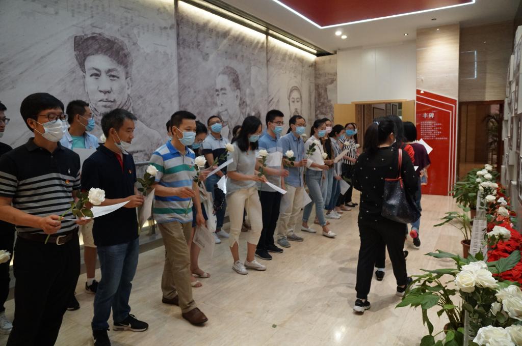 在党建馆大厅,全体党员面对鲜红党旗,庄严宣誓,字字铿锵,重温入党时的理想信念,表达为党的事业奋斗终身的坚定决心。滨湖区党建馆以中国共产党红色精神为主线,分8个部分展示了红船精神、井冈山精神、延安精神、西柏坡精神、红旗渠精神、载人航天精神等35种中国共产党在不同时期形成的伟大精神。一组组详实的史料、一幅幅真实的照片、一幕幕感人的场景,折射着我党的发展历程,记载着中华儿女辉煌的瞬间,也深深感染了每一位参观的党员。最后全体党员来到革命先烈群像前,齐声诵读缅怀诗文,向革命先烈敬献鲜花。