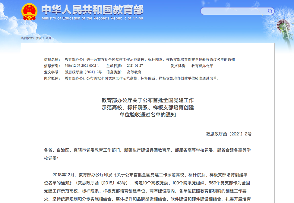日前,教育部办公厅发布了《关于公布首批全国党建工作示范高校、标杆院系、样板支部培育创建单位验收通过名单的通知》。beat365在线唯一官网党委经对标自查总结、上级党组织满意度测评、属地教育工委把关复核、教育部思想政治工作司审查,顺利通过验收。
