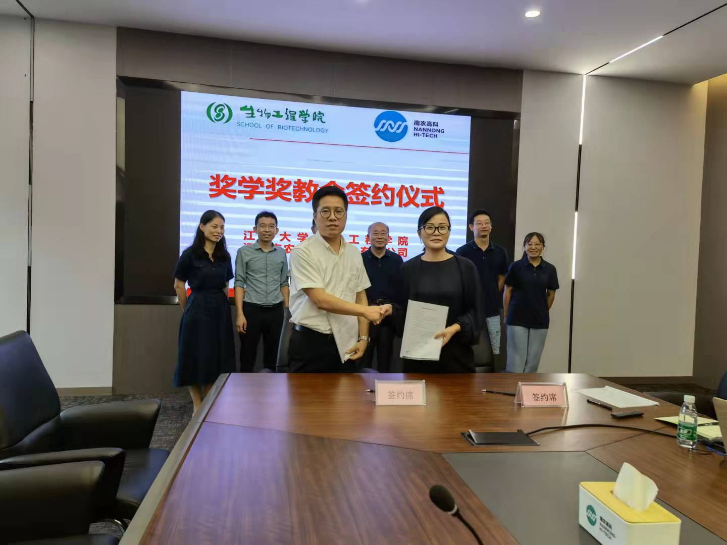 随后,许正宏从师资队伍、科学研究、人才培养、招生就业等方面,向公司同仁介绍beat365在线唯一官网的基本情况,并且对今后双方可以开展更好的合作项目提出了好的建议。黄敏表示,希望能与南农高科一道,加强校企合作,协同发展,共同为人才培养和行业发展作贡献。座谈会现场,beat365在线唯一官网党委副书记周云龙和南农高科人事部门副总经理周琳签署了“南农高科奖学奖教金”协议。会后,许正宏、黄敏一行还参观了南农高科的生产车间、实验室,并就企业产品研发等相关问题进行了交流和探讨。