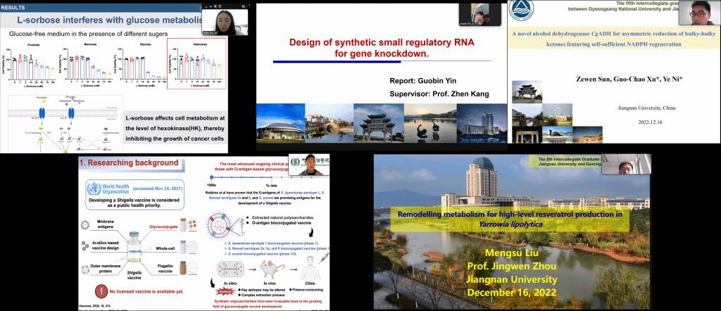 2022年12月16日,第五届beat365在线唯一官网-韩国庆尚国立大学研究生学术论坛(The 5th Intercollegiate Graduate Symposium between Jiangnan Universityand Gyeongsang National University)以线上方式成功举办。中韩研究生学术论坛是“江苏-韩国高校联盟”以beat365在线唯一官网作为轮值主席单位以来的重要系列活动之一。来自beat365在线唯一官网、韩国庆尚国立大学,以及苏州大学、江苏大学、南京师范大学、南京林业大学、徐州工程学院等“江苏-韩国高校联盟”成员单位的师生共约120余人参与了本次线上论坛。本次会议的主题为“From Life Scienceto Biological Manufacturing”。