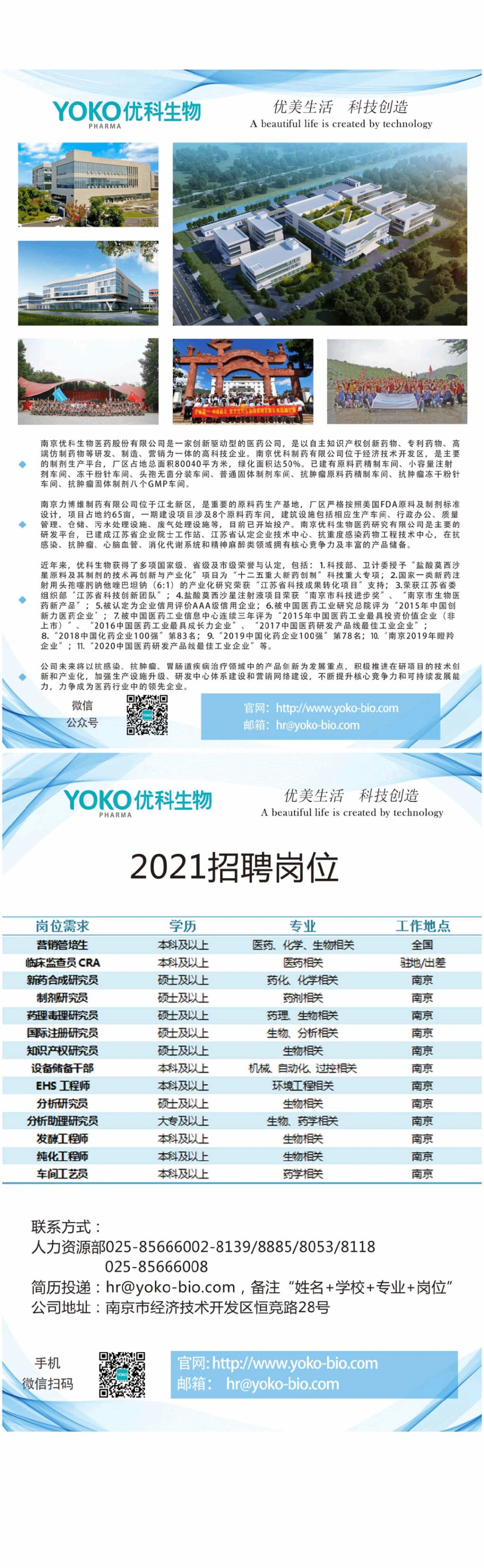 生工学院【2021】097号 南京优科生物医药股份有限公司招聘简章