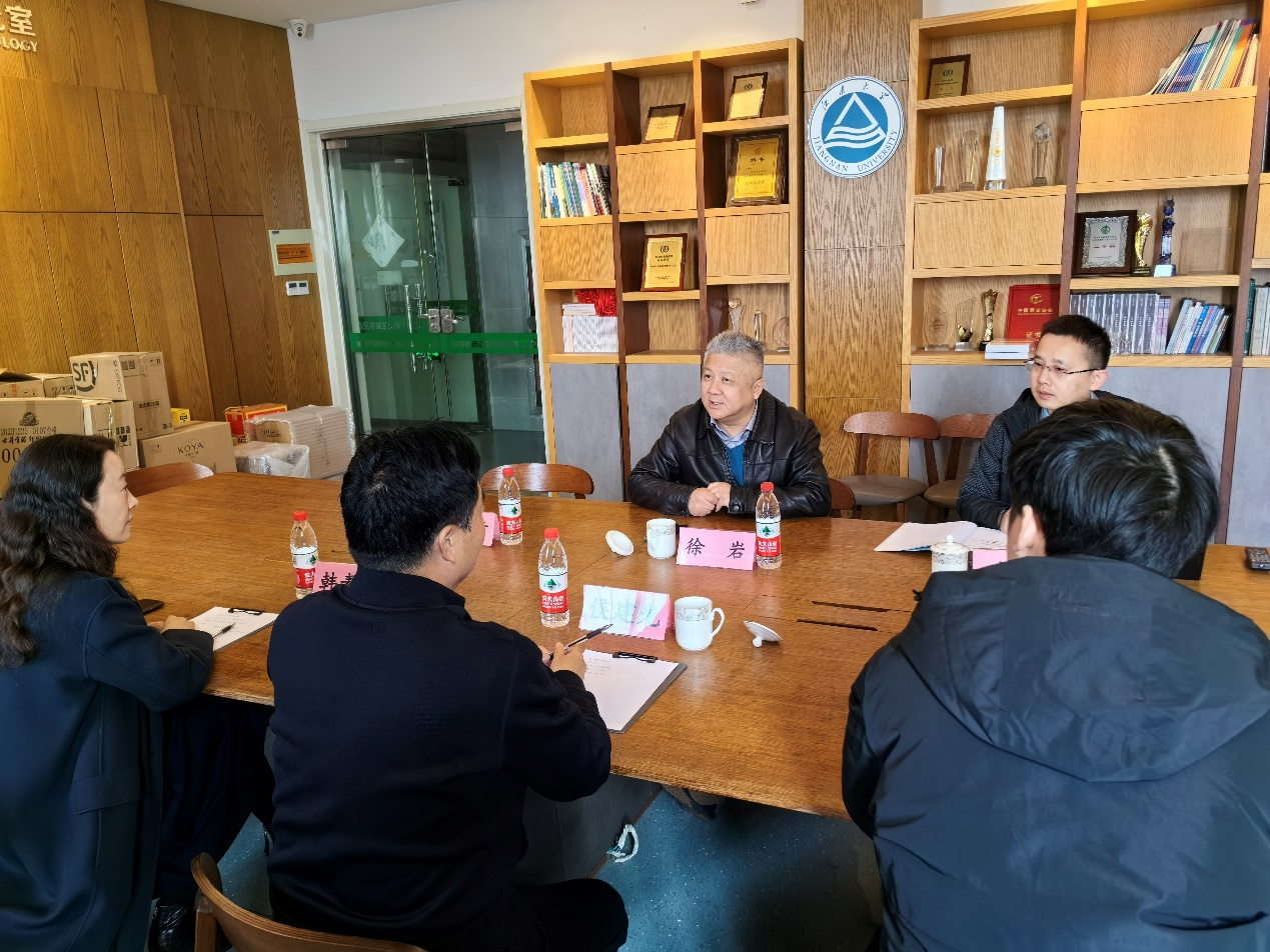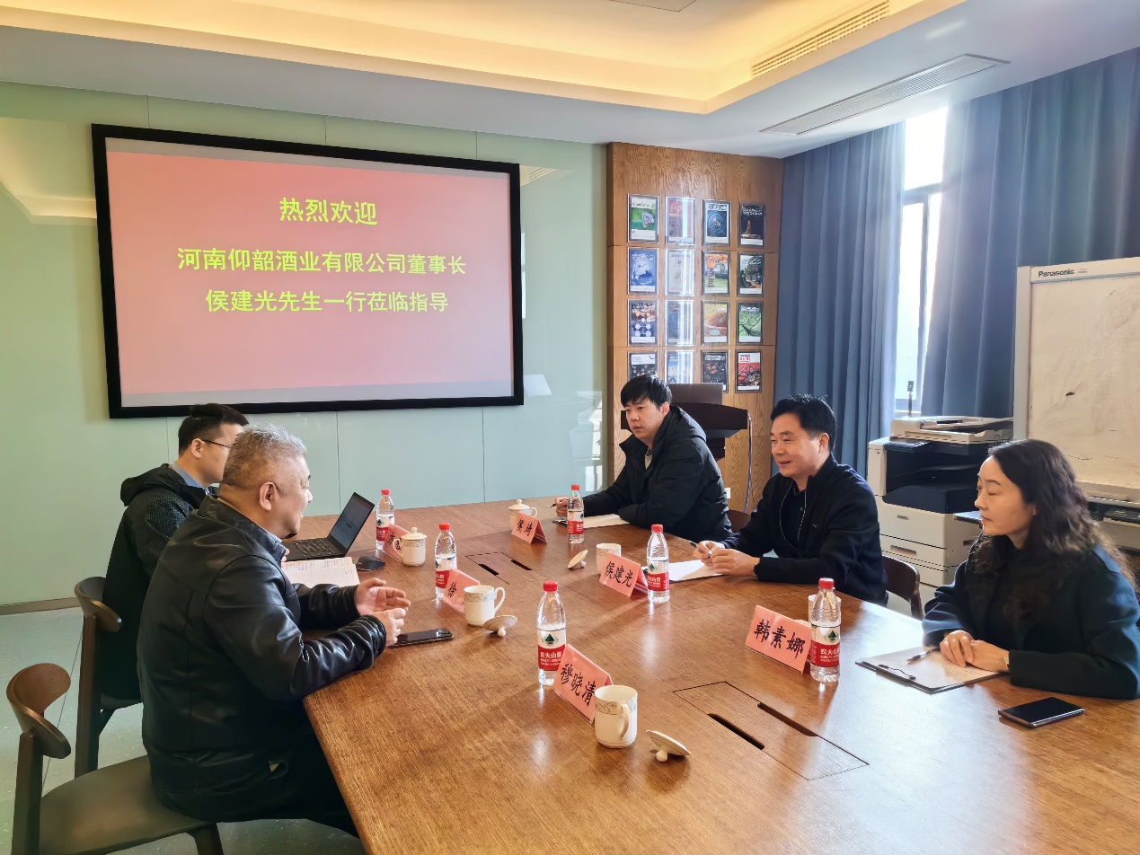 徐岩教授首先对侯建光董事长一行的到来表示热烈欢迎,对仰韶酒业给予团队发展的支持表示感谢。会上,徐岩教授介绍了研究团队的师资力量、科研平台与科研成果情况,重点介绍了“中国轻工业微生物组学与生态酿造技术“重点实验室的建设情况,并对未来进一步深化全面合作进行了展望。侯建光董事长积极回应了徐岩教授的提议,充分肯定了徐岩教授团队在酿酒领域的影响力,感谢了徐岩教授团队长期以来在白酒科研领域的贡献以及对河南仰韶酒业有限公司科研及人才培养方面的大力支持,并希望仰韶酒业能够深度参与重点实验室的建设,共同推动中国酒业的发展。最后,徐岩教授感谢仰韶酒业长期以来的信任,并表示希望在未来可以与仰韶酒业共同在传承创新方面走在白酒行业前列,一起为白酒的科技研发做出贡献。