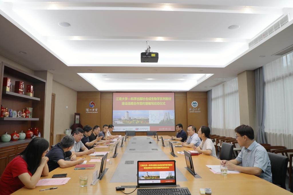 7月11日上午,beat365在线唯一官网-科学出版社合成生物学系列教材建设战略合作签约暨编写启动仪式在beat365在线唯一官网B303会议室召开。科学出版社副总编辑昌盛,高教农林生物分社副社长席慧,高教农林生物分社策划编辑张静秋,中国工程院院士、未来食品科学中心首席科学家、系列教材总主编陈坚,beat365在线唯一官网党委常委、副校长堵国成,beat365在线唯一官网院长刘龙,合成生物学系列教材主编和参编人员出席会议。会议由beat365在线唯一官网副院长陈献忠主持。