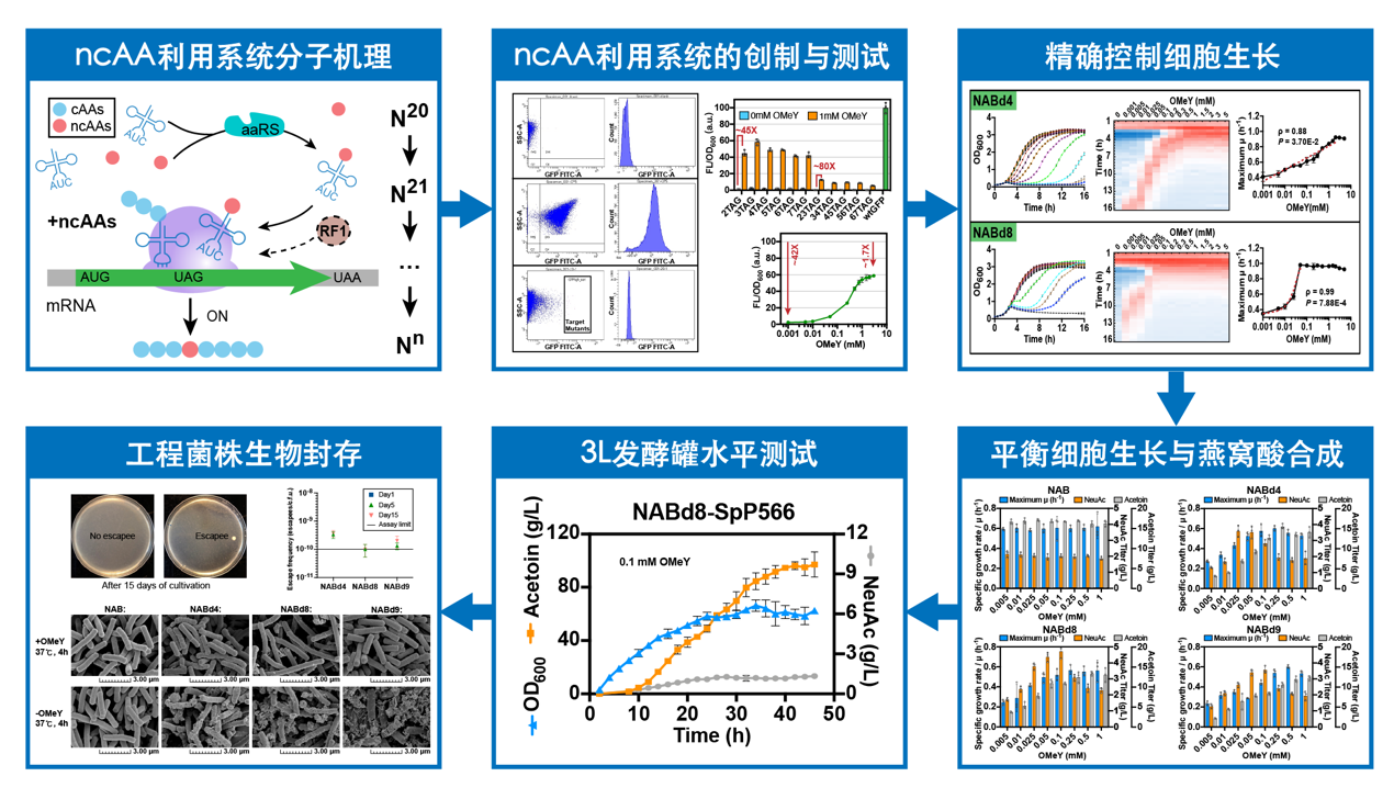 在该研究中,为了扩展细胞生长调控方法适用范围局限并且避免胞内代谢物干扰的问题,研究人员引入了基于密码子扩展的正交翻译系统。该系统可以实现在代谢流调控和细胞生长关键酶中插入非天然氨基酸(ncAA),并通过“精确滴定非天然氨基酸来精准控制代谢流量和细胞生长。研究人员分别在基因组重编码的大肠杆菌与基因组未重编码的枯草芽孢杆菌中进行了测试。通过精确控制ncAApAcF)添加,产N-乙酰氨基葡萄糖(乙酰氨糖)的大肠杆菌细胞生长与乙酰氨糖合成同时改善,菌株OD600提高2.1倍,乙酰氨糖产量提高4.5倍。在枯草芽孢杆菌中,研究人员结合理性设计与非理性筛选,首先成功构建了ncAA高效利用系统,实现约80倍的基因表达水平激活。然后,通过精确控制ncAAOMeY)添加,实现了产N-乙酰神经氨酸(燕窝酸)重组枯草芽孢杆菌的最大比生长速率的精准控制,燕窝酸产量提高2.2倍,副产物乙偶姻产量降低87.2%。最后,研究人员扩展了细胞生长精准调控系统的应用规模与应用功能,分别实现了3 L发酵罐中燕窝酸产量提升3倍(至9.7 g/L)与重组枯草芽孢杆菌的生物封存” (避免重组菌逃逸至自然环境中繁殖),为生长与代谢精准可控高版本底盘细胞创建提供了新策略。